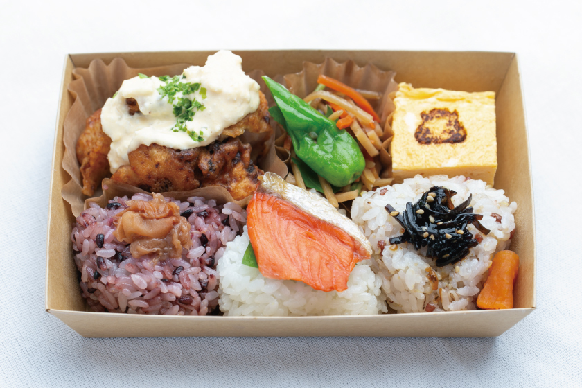 サクサクのとり天に、ピリッとした南蛮ソースがかかり、3種類のおにぎりとともに楽しめる弁当です。