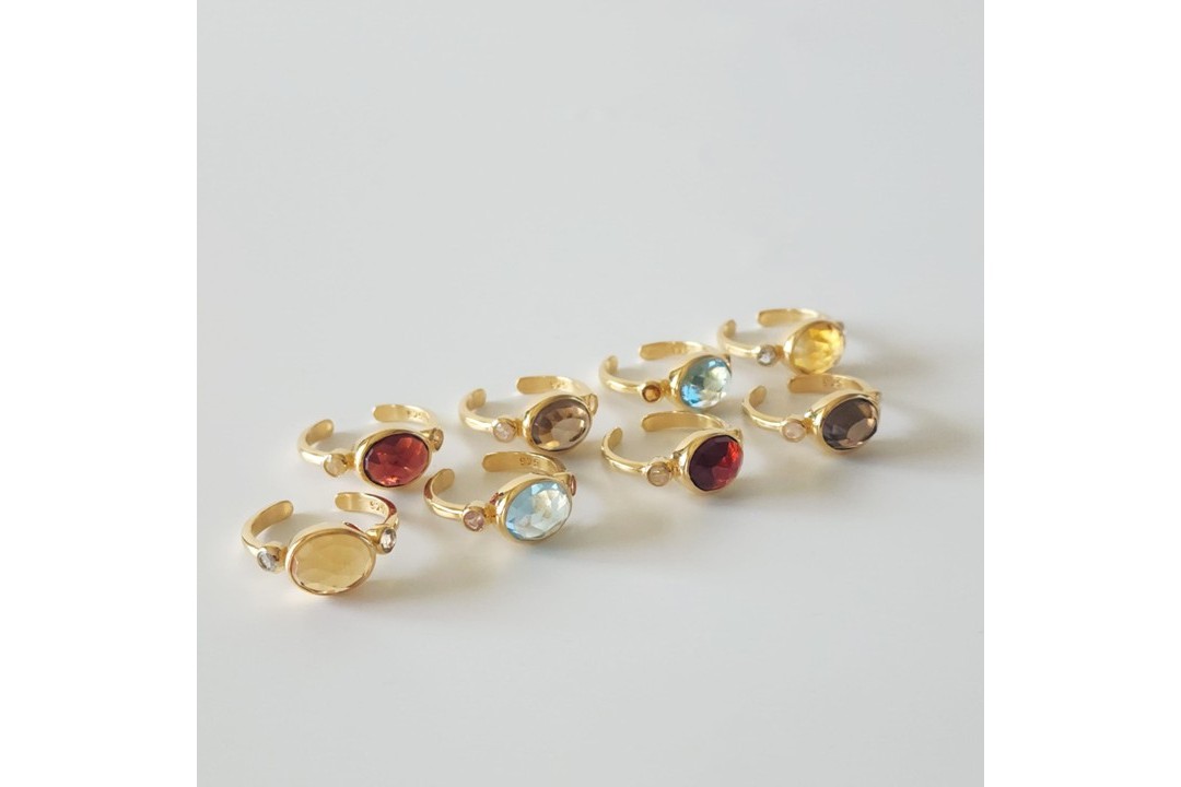 ガーネット、ブルートパーズ、スモーキークォーツ、ルチルクォーツ、シトリンの5種類の天然石で展開し、その天然石の両サイドにそれぞれカラーの異なる天然石を使用。