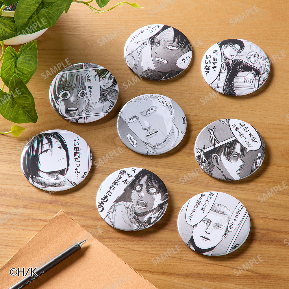 『進撃の巨人』の原画をプリントした缶バッジを全8種類セットに。
