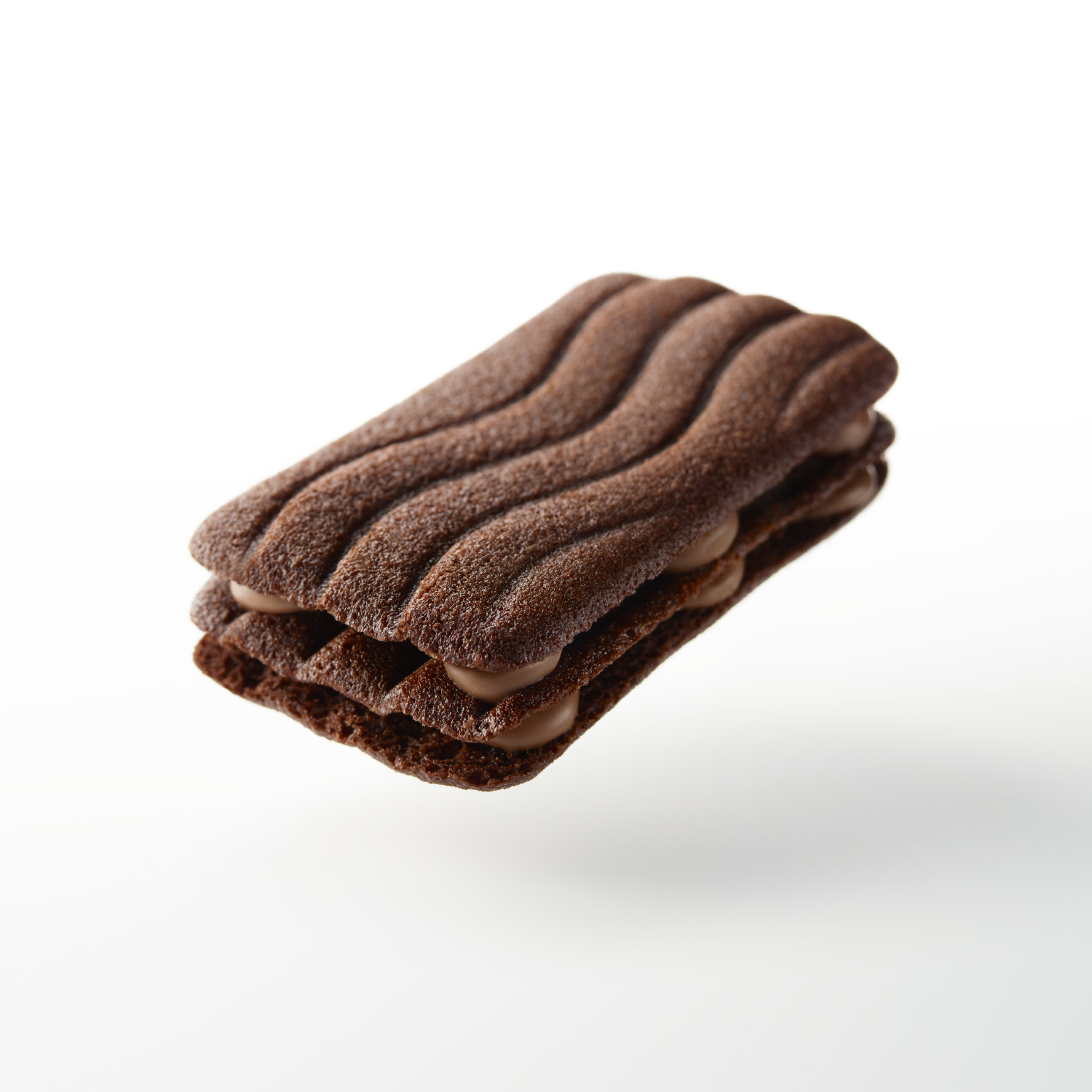 チョコレート風味のラングドシャ・クッキー。うすく、上品に焼き上げたラングドシャを、特製チョコレートのピラー(柱)で、ていねいに3層に組み上げています。