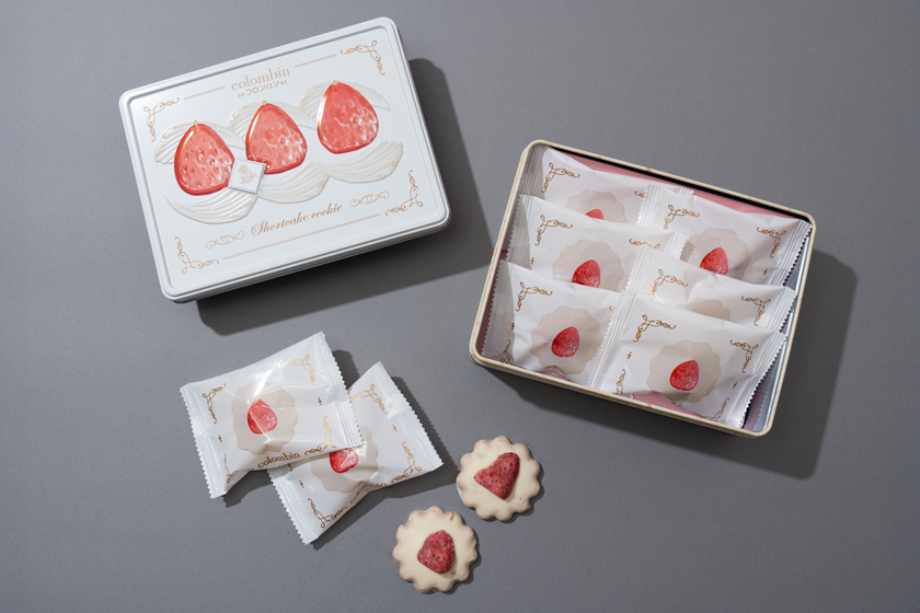 日本で初めてショートケーキを考案した「コロンバン」のクッキー缶は、見た目も味もまるでショートケーキのようなクッキー。苺ペーストとフリーズドライ苺、練乳を加えた“いちごミルク”テイストのクッキーを、生クリームのような味わいのホワイトチョコレートで包みました。トッピングには、チョコレートを染み込ませた風味豊かな国産いちご『紅ほっぺ』を贅沢に使用。缶もショートケーキの断面をイメージしたデザインで開ける前からワクワク感を感じられるクッキー缶です。