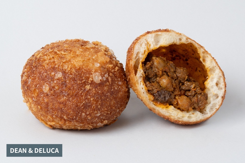 まん丸でボリューム感のある「DEAN & DELUCA」のカレーパンは、食べ応えがあり満足感100点!玉ねぎ、にんじん、ひよこ豆、レーズンを加えてじっくり煮込んだオリジナルレシピのキーマカレーを、フォカッチャ生地にたっぷり詰めて揚げた、お店オリジナルのカレーパンです。外側はザクザク、中はもちもち食感の生地と、キーマカレーの相性抜群。本格的なスパイスの奥深い辛みと、野菜の甘さがマッチし、ほど良い刺激が楽しめる大人のカレーパンです。店頭には他にも、目写しちゃうほどパンやデリが種類豊富にラインアップしているので、ランチにピッタリなコンビを見つけてみて!