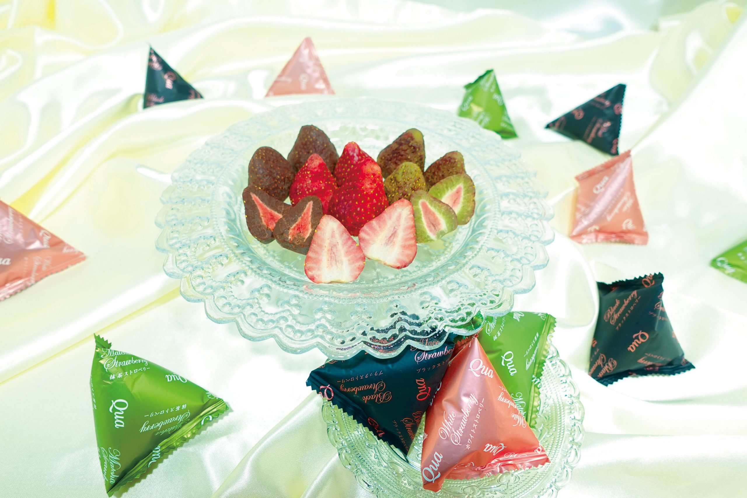 Qua定番の「ホワイトストロベリー」、カカオ香る「ブラックストロベリー」、新登場!「抹茶ストロベリー」の3種をオリジナルギフト箱にセットいたしました。