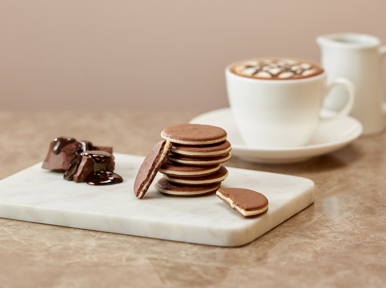 ショコラ生地にほんのりコーヒーをきかせたクッキーで、ホワイトミルクのチョコレートをサンド。サクッと軽やかな口あたりとともに、まるでショコララテのようなチョコレートの濃厚な甘さとミルクのクリーミーな余韻が広がる、癒しの味わいが魅力です。