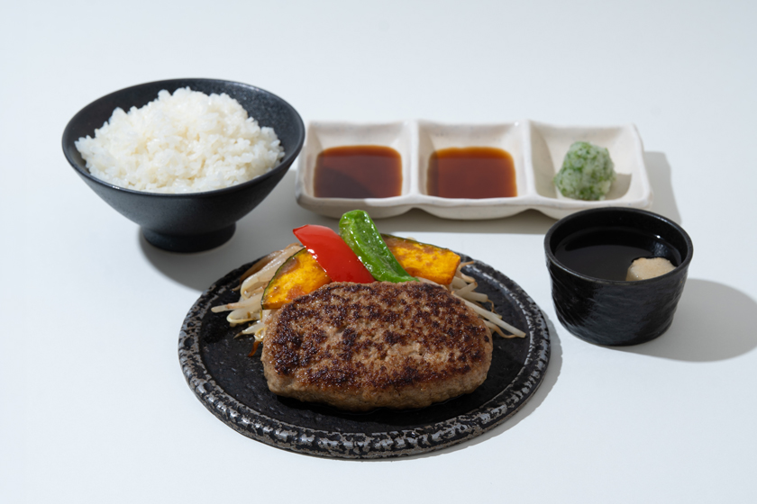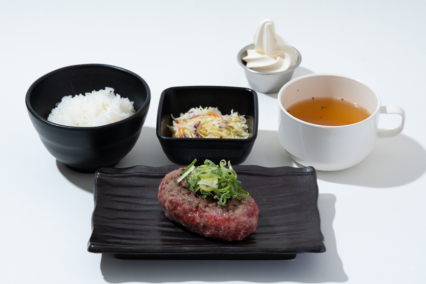 九州産の黒毛和牛と国産牛を独自の配合でブレンドし、つなぎを極限まで減らした玉ねぎ不使用のハンバーグは、まるでステーキのような味わい。表面のみ焼き目を付けた状態で提供されるので、鉄板で一口ずつ焼きたてを食べることができます。6種のソースで味わいを変えることができ、“マイスタイルハンバーグ“を堪能できるのも魅力!“羽釜炊き”で炊いたふっくらとしたご飯と一緒に頬張れば、肉の旨味がダイレクトに感じられます。デザートにソフトクリームがついてくるのも嬉しいポイントです。