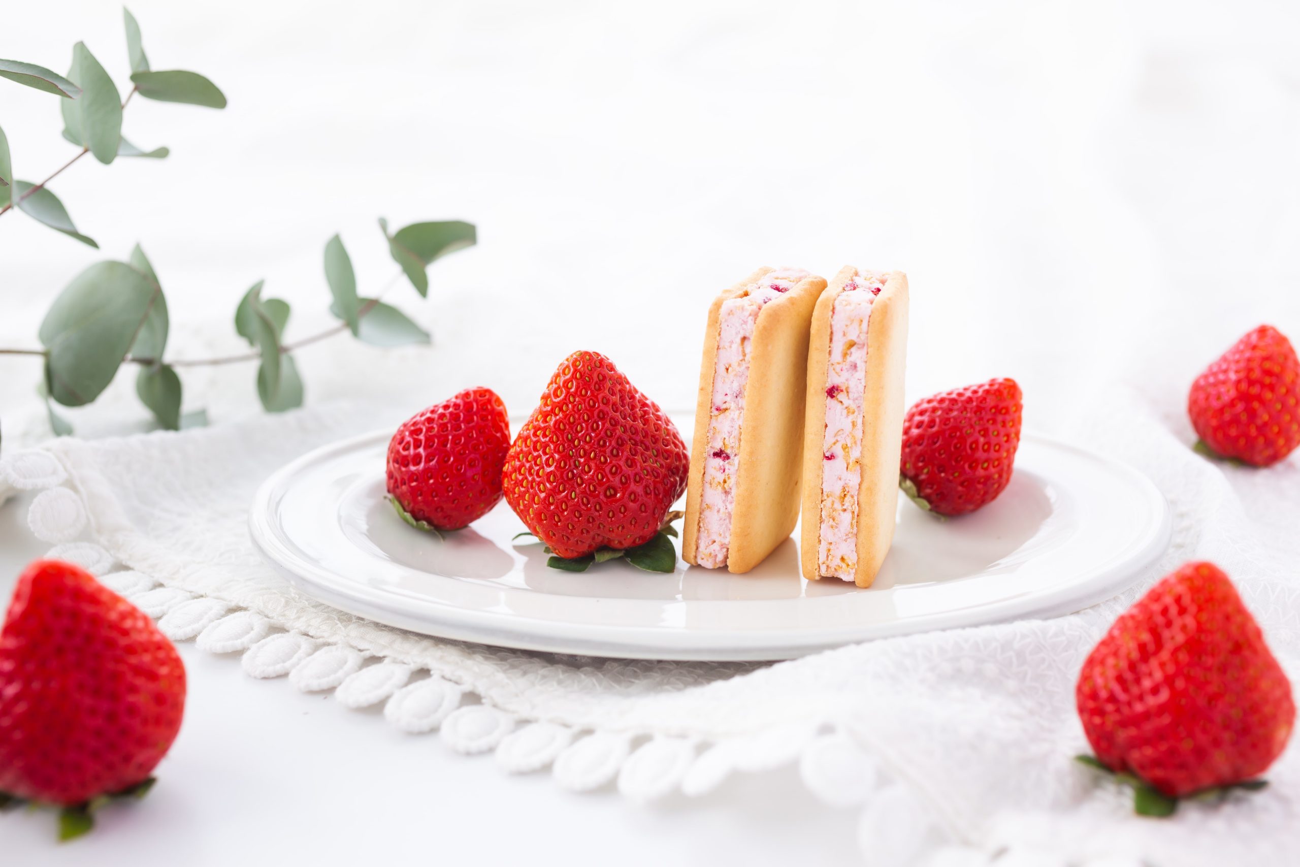 あまおう苺のパウダーとラズベリーのフリーズドライが入ったホイップチョコをバター薫るクッキーでサンドしました。