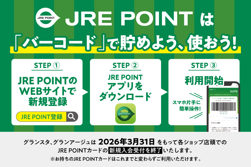 グランスタ、グランアージュでは、2026年3月31日をもちまして、JRE POINTカード新規入会受付を終了させていただきます。
