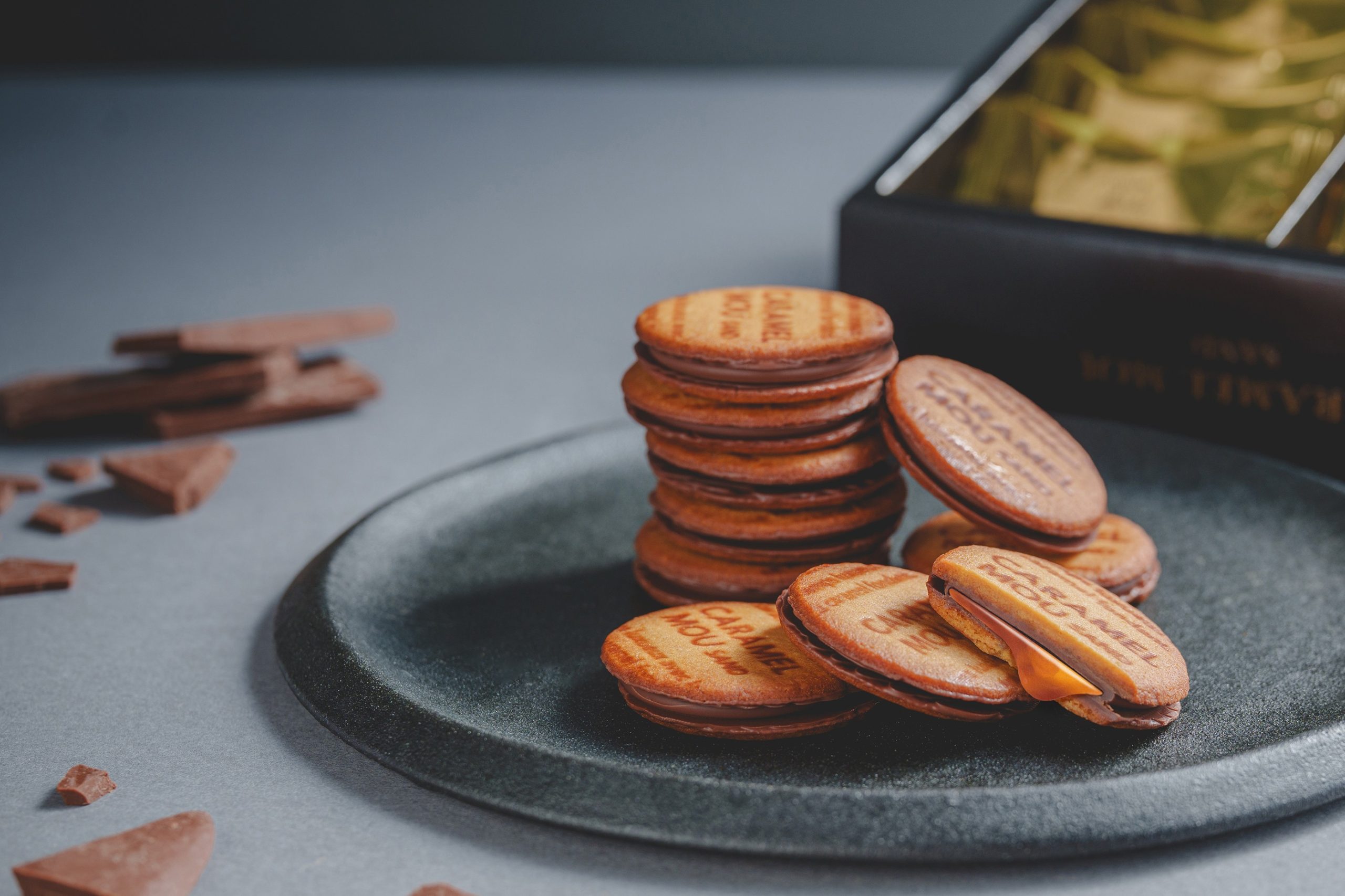 丁寧に煮詰めたキャラメルを口どけの良いチョコレートでコーティングし、さっくりとしたクッキーでサンドしました。とろけるキャラメルの黄金のような輝きと贅沢なひとときをお楽しみください。