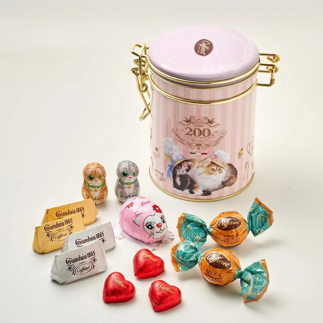 可愛らしいネコが描かれたキャニスター缶に、自慢のチョコレートをアソート。