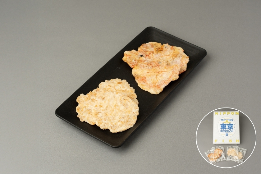 旬の魚を使った海鮮丼や、珍しい魚のお造りなどを揃える「サカナバッカ(sakana bacca)」。『東京さかなせんべい』は、兵庫県の柴山漁港で水揚げされた極上の甘エビを一尾そのまま使用した濃厚な味わいの『甘エビ』、ホタテの耳(貝ひも)を中心に使用し海の恵みを閉じ込めたような旨みの『ホタテ』の2種がはいったおせんべい。鉄板でプレスし焼き上げ、仕上げに油で揚げているのでパリッとした食感と美味しさを楽しめます。おつまみとして味わえば、お酒が進みそうです!
