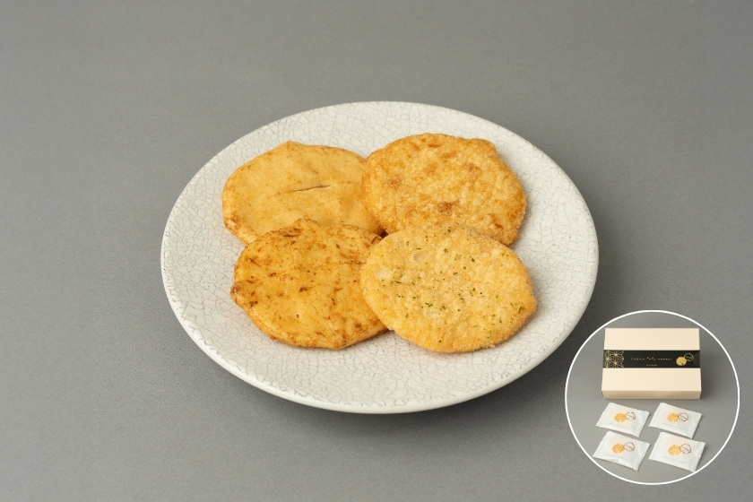 東京駅の名所“銀の鈴”をモチーフにした『東京鈴せんべい』は、見た目が可愛らしい鈴の形のおせんべい。あっさりとした味わいでシンプルなおいしさの『揚げせんー焼塩ー』、素材の風味をいかして噛むほどにお米の甘さを感じられる『だし醤油』、こめ油でさっくりと揚げた香ばしい風味と程よい甘さの甘醤油味の『揚げせんー甘醤油ー』、旨味のきいた鰹節とピリッと七味唐辛子がアクセントになった後引く美味しさの『かつお七味』の4種入りでそれぞれの美味しさを楽しめます。目上の方への“きちんと手土産”にもオススメです。