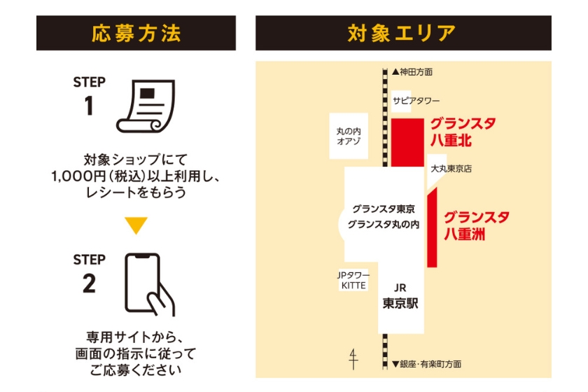 改札外 グランスタ八重北(B1:黒塀横丁/1F:八重北食堂/2F:北町酒場)・グランスタ八重洲(B1~2F)の対象ショップで、2026年2月2日(月)~2月23日(月)に税込 1,000円以上ご利用いただいたレシートで応募できる抽選会を実施します。期間中は何回でも応募可能、レシート1枚につき1回応募できるので、お買い物・お食事の際は、スマホでチャレンジしてみてください!“おいしい”プレゼントが当たるチャンスをお見逃しなく。