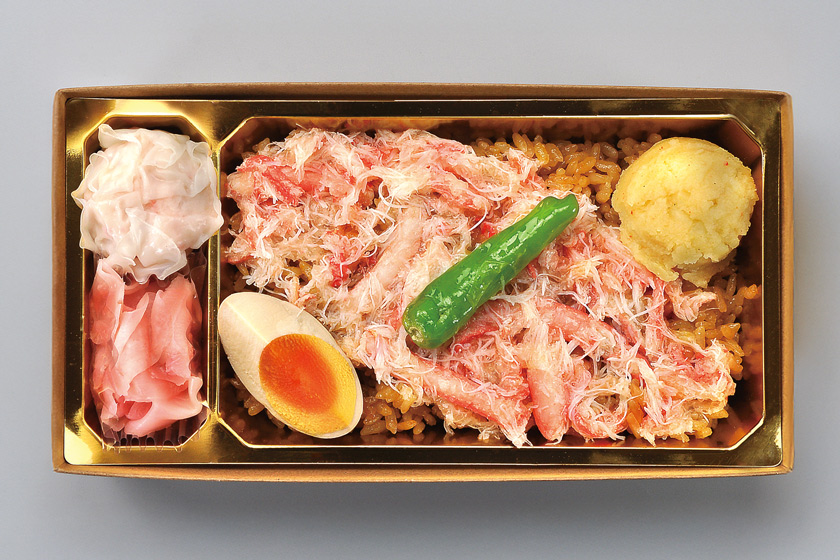 うぶかは、店主が小さい頃から甲殻類が好きで「甲殻類のみのコース料理が出てくるお店があれば」という夢から生まれたショップ。海老と蟹の出汁でじっくり炊き込んだご飯に、蟹のほぐし身をたっぷりのせた、甲殻類好きの方にはたまらないお弁当です。