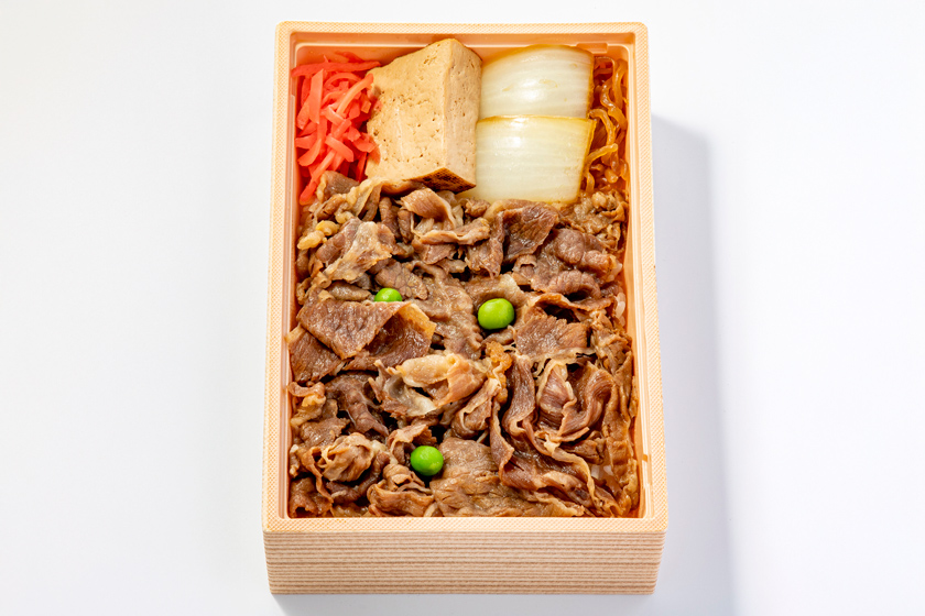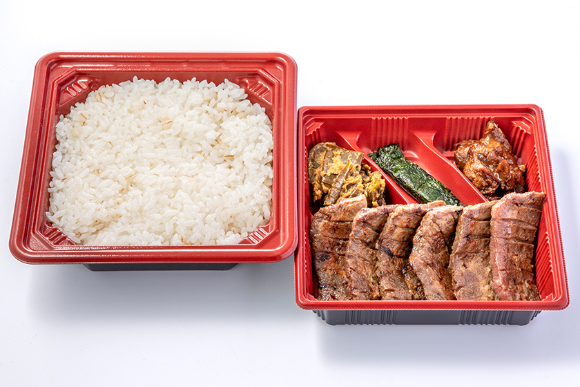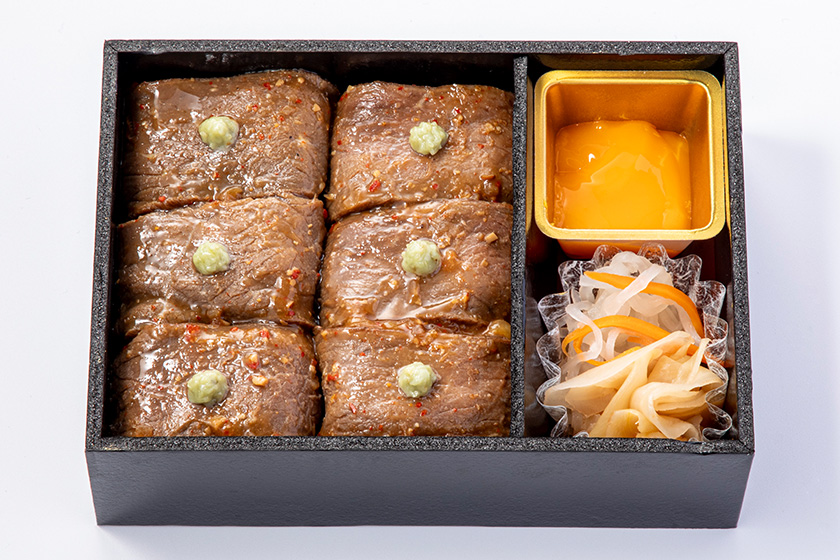 厳選した国産黒毛和牛の特上カルビ肉をじっくり低温調理し、甘みを引き出した「和牛ステーキ」と、特製の割り下で炊き上げた「牛めし」の2種類の牛肉のおいしさを楽しめるお弁当です。低温でじっくりと焼き上げたステーキ肉は、和牛ならではのまろやかな風味と口当たりが特徴。オリジナルの和風にんにく醤油ソースとよく合います。