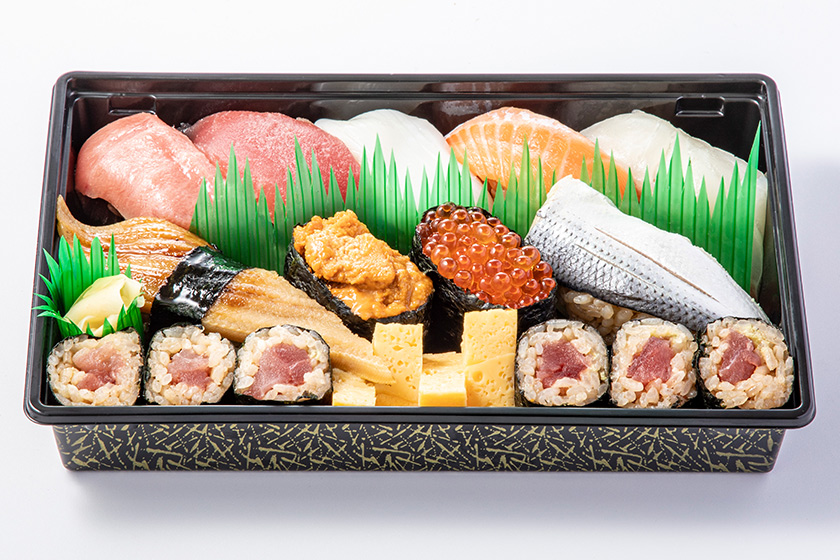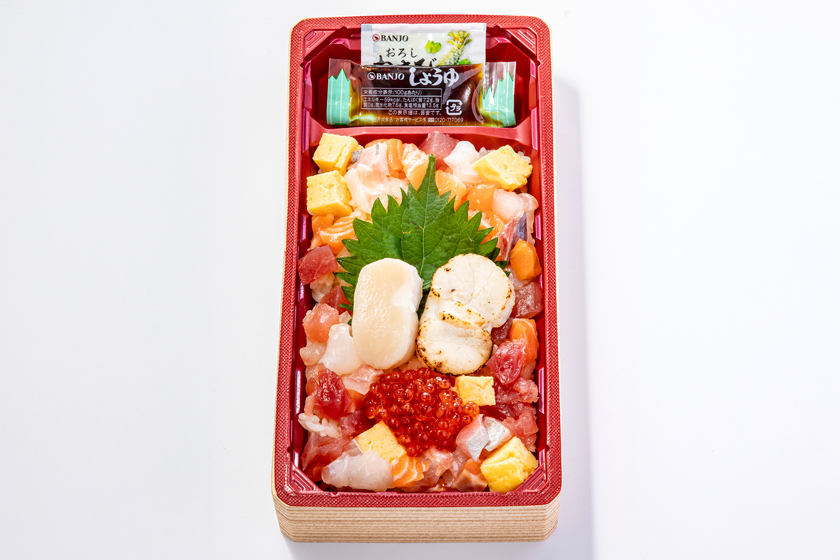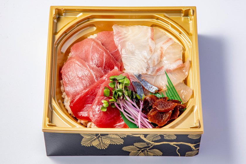 近畿大学生まれの完全養殖の稚魚から育った鮮魚をふんだんに使用しています。紅色は「近大生まれのマグロ」、白色は「近大生まれのマダイ」「近大生まれのシマアジ」を使用し、食材でおめでたい紅白を演出したお弁当です。