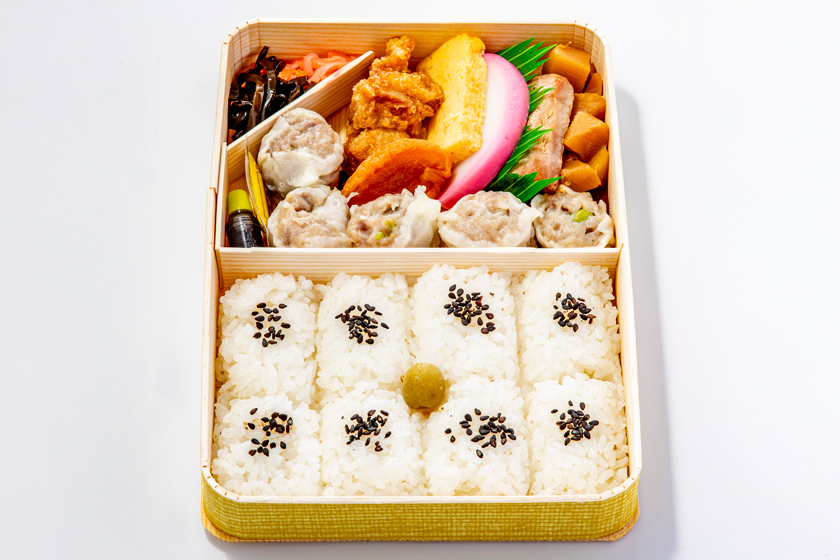 お米を蒸し炊きした、俵形ご飯と筍煮人気のシウマイなどが入ったお弁当です。