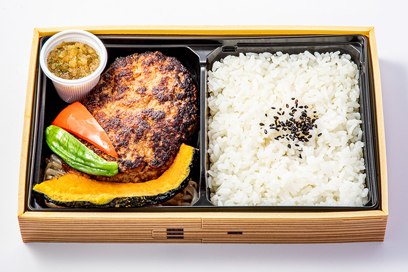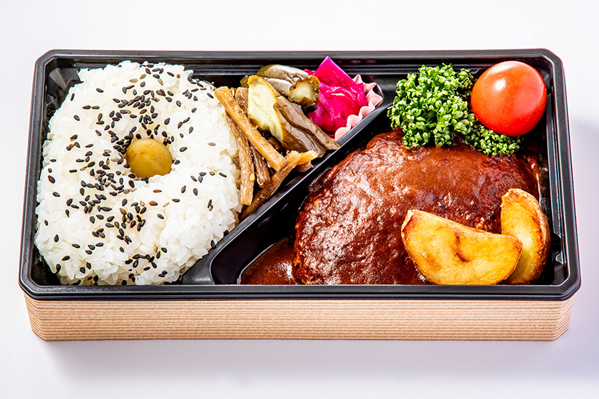 レストランそのままの味をご家庭や旅先でお気軽にお楽しみいただけるお弁当。ハンブルグステーキは国産の牛肉・豚肉を使用、ショップのキッチンで挽き肉にするところから手作りし、一つひとつ丁寧にふっくらジューシーに焼き上げています。仕上げは、自家製のデミグラスソースをたっぷりとかけました。ご飯は新潟県産のコシヒカリをショップのキッチンで炊き上げています。