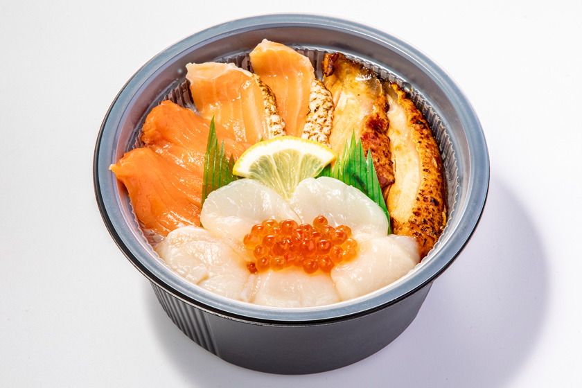 青森県産のサーモンのおいしさを「お刺身・炙り・蒲焼」の3種の食べ方でご提供。さらに北海道産のホタテを贅沢に使用した、至福の海鮮丼です。口の中でとろけるサーモンの旨みとホタテのプリプリとした食感を、ぜひお楽しみください。