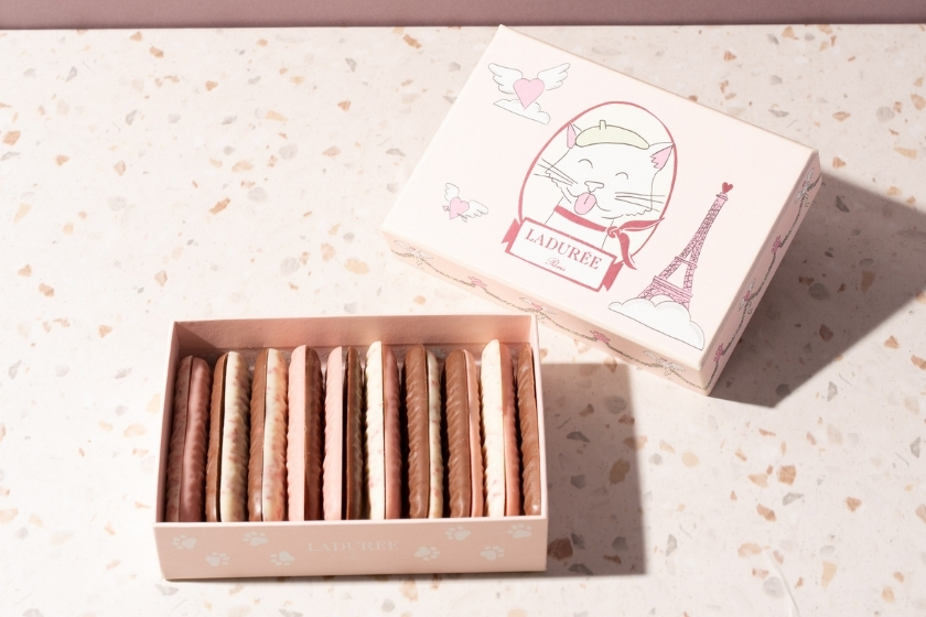 猫の舌をかたどった苺フレーバーのホワイトチョコレート、苺のフリーズドライを散りばめたミルクチョコレートと、バニラフレーバーのホワイトチョコレートの3種の詰め合わせ。フランス人アーティスト、ギョーム・サルダン氏による、遊び心あふれるロマンティックなパリとベレー帽をかぶった猫のイラストにも注目です。ラデュレ(Ladurée)日本限定のスイーツをお見逃しなく。
