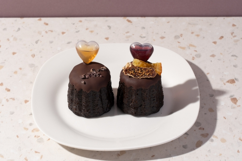 「信州ウイスキーボンボン」は、食べる直前にスポイトのオーガニックハニーで贅沢な甘さをもたせたウイスキーを注ぎこむ、新感覚のカヌレ。チョコレートの中から、魅惑の蜜があふれ出します。「サングリア・ショコラ」は、マンディアンのように華やかなカヌレ。ドライフィグ、オレンジドライ、ローストアーモンドが織りなすさまざまな食感を楽しめます。さらに、スポイトの赤ワインソースをたっぷり絡めると芳醇な味わいのハーモニーが広がります。