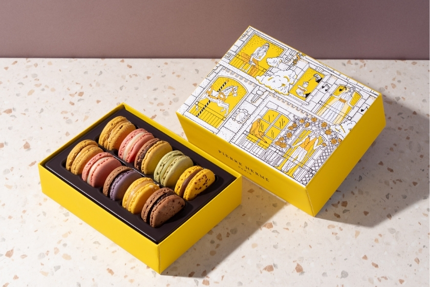 洗練された珠玉のお菓子。バレンタインに合わせて、ブラジル・パイネイラス農園産純正チョコレートに対するオマージュが込められた「アンフィニマンショコラパイネイラス」や甘く濃厚なカラメルと力強いビターチョコレートの「プレニチュード」など、チョコレートフレーバーを中心に8種10個を詰め合わせました。イラストレーター、ジュリー・セールによるパリの雰囲気に満ちた夢のようなシーンが描かれた限定BOXでご用意いたします。