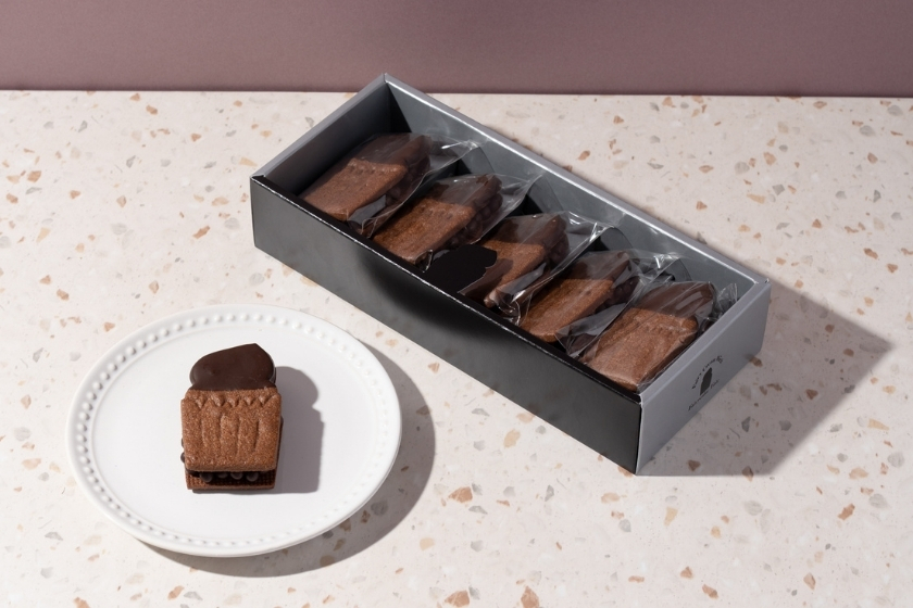 ココア風味のラングドシャに、ラム酒の香るショコラあんとショコラバターをサンドしました。チョコレート好きにはたまらない、大人の甘さが楽しめるラングドシャサンドです。